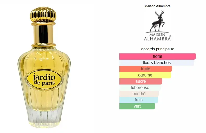 Jardin de Paris de Maison Alhambra est un parfum féminin captivant et raffiné, inspiré par l’élégance intemporelle et le romantisme parisien. Cette fragrance florale et lumineuse s’ouvre sur des notes fraîches et fruitées, évolue vers un cœur floral délicat et se termine par une base douce et boisée, offrant une sensation de luxe et de féminité durable.